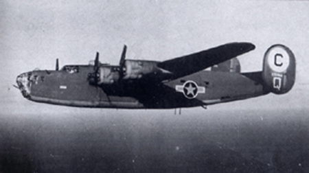 The 389th BG's original aircraft were B-24Ds. This 24D, flying with the "belly" ball turret retracted, is shown early in its career before if was named Jackass Male.
