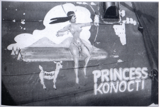 Princess Konocti showed a front and rear side. The princess and her pet deer, "Bombi", flew with the 567th Squadron of the 389th BG.